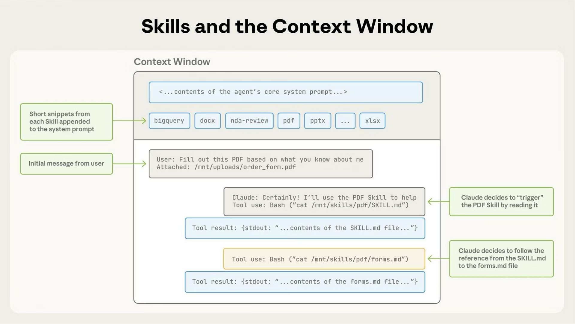 Anthropic provides a nice graphic showing an example of using a PDF Skill to complete a PDF form for a user.