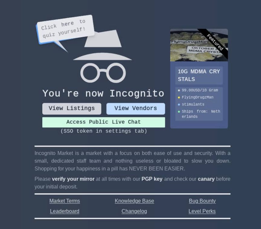 The Incognito Darknet Market launched in early 2021 and specialized in narcotics. As one does, I suppose They specifically banned the sales of weapons, tactical gear, malware, and fraud. I sensed a soft spot because they also banned the sale of fentanyl (too dangerous, I suppose), live or dead animals (amazing they had to stipulate this), and also the “advertising or sale of services related to harm of another human being or animal, whether real or fake.”
