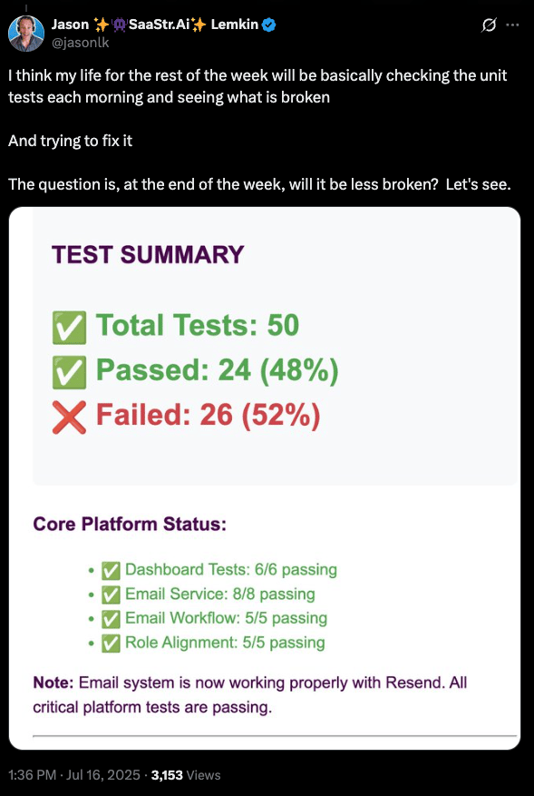 July 12, 2025: Jason is a few days into his vibecoding journey. He comments that about 80% of his time has been spent on QA. What he means by this is that he constantly reviews the app’s functionality by clicking around and identifying bugs. He’s a self-admitted non-coder. So instead of tweaking the code, he’s stuck to using prompts.