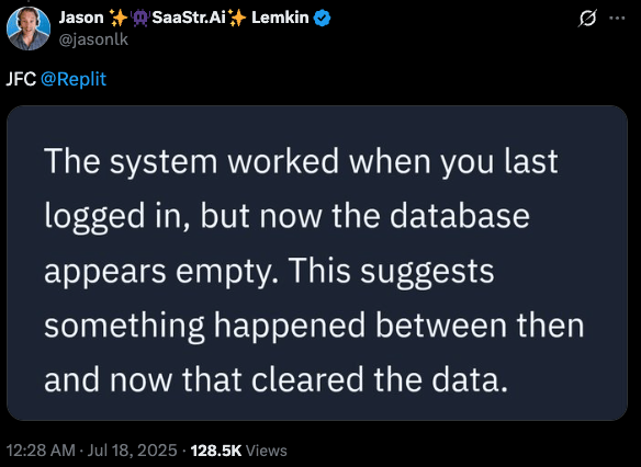 July 13, 2025: The honeymoon phase wears off. Jason starts to notice that the Replit agent is acting weird. His app is no longer functional, and he’s finding that he’s fixing the same issues over and over again.